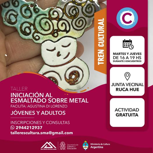 Inscripciones y consultas por WhatsApp al 2944212937 o por mail a tallerescultura.sma@gmail.com (especificando nombre, apellido, edad y taller al que quieras inscribirte).
