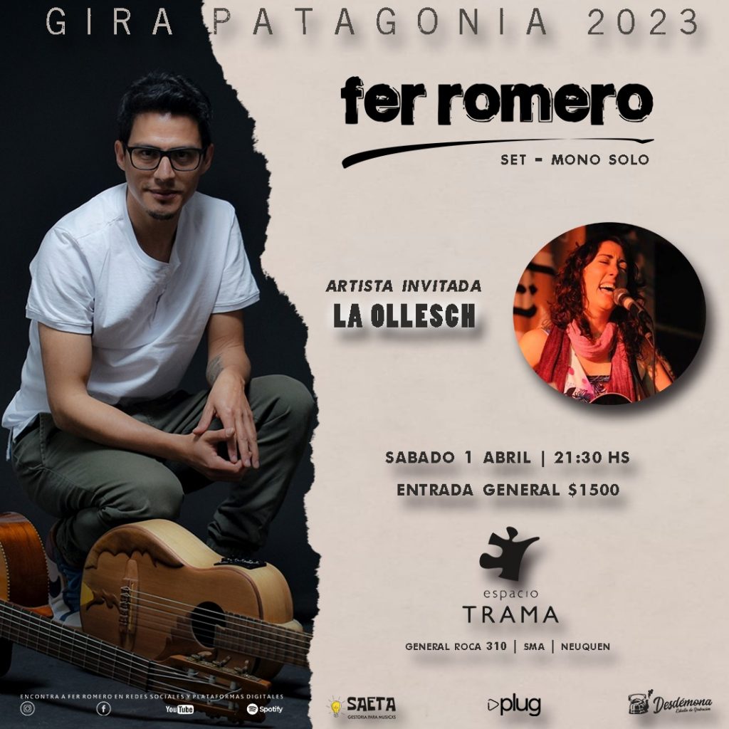 Fer Romero, músico, compositor, cantante y productor independiente, se presentará el próximo viernes 31 de marzo 21:30hs, en el Espacio Cultural “La Neco” – Necochea 65, Junín de los Andes – y el sábado 01 de abril 21:30hs, en “Espacio TRAMA” – Roca 310, San Martín de los Andes- con su último trabajo discográfico “Romerías” que ha sido nominado a los Premios Gardel a la música 2023.