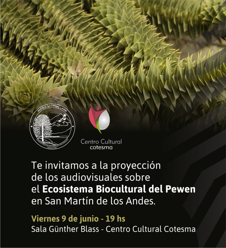 El viernes 9 de junio a las 19 hs te invitamos a conocer y compartir todo lo que gira alrededor de un gran árbol como es el Pewen. Proyectaremos los audiovisuales realizados en el marco del Proyecto Pewen, a través de los mismos queremos compartir los valores del ecosistema del pewen, la vida que lo rodea, sus amenazas de conservación, saberes ancestrales mapuches y las múltiples interacciones humanas con el mismo.