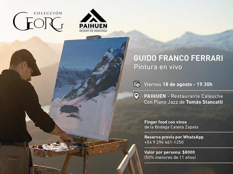 Paihuen y Colección Georg los invitan a disfrutar de una noche diferente en San Martín de los Andes, con pintura en vivo de Guido Franco Ferrari.