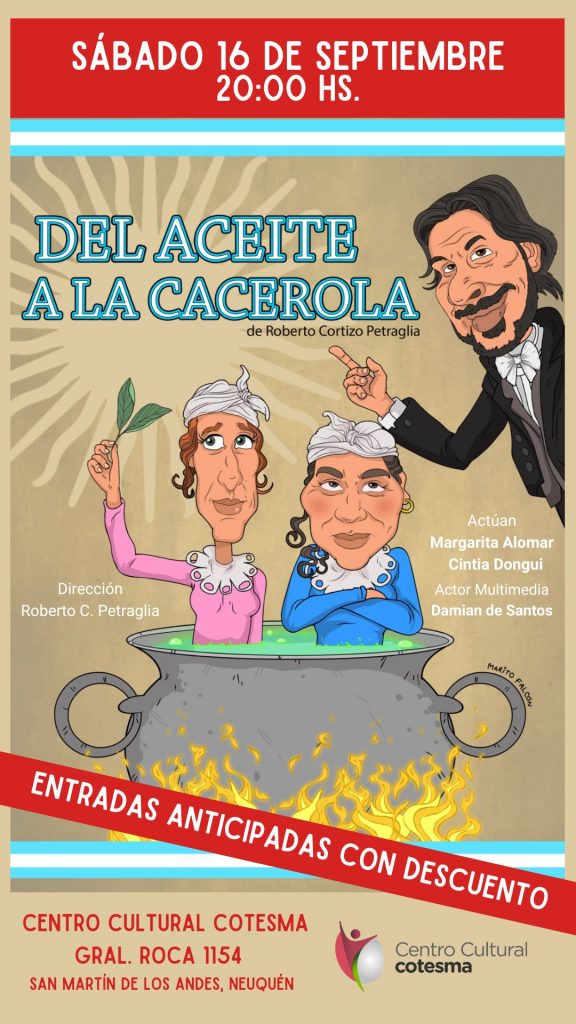 El próximo sábado, 16 de septiembre a las 20hs, en nuestra querida Sala Amankay, volvemos a vivir una imperdible propuesta teatral. Llega a San Martín de los Andes “DEL ACEITE A LA CACEROLA: UNA DELIRANTE HISTORIA DE LA HISTORIA ARGENTINA”