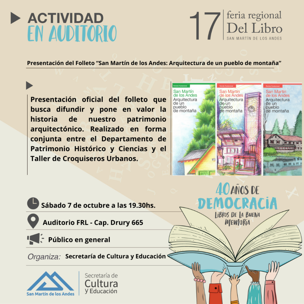 19:30 hs. Sr. Gustavo Santos. Lic. Alejandra Muriel Lema. Lic. Federico Peralta Godoy. Presentación del folleto “San Martin de los Andes. Arquitectura de un pueblo de montaña”. Organiza: Secretaría de Cultura y Educación.