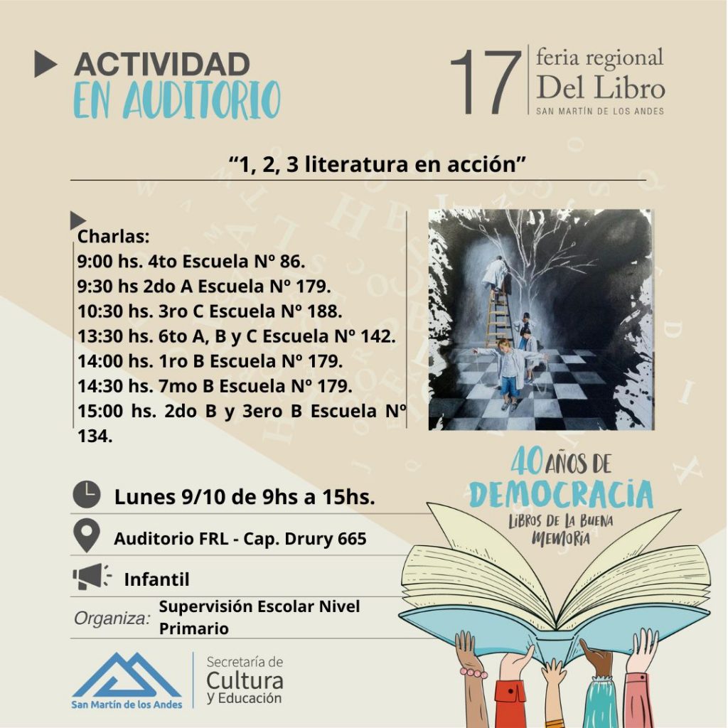 9:00 a 10:30 hs. Actividad de escuelas primarias. Conferencia “1, 2, 3 literatura en acción”. Organiza: Supervisión Escolar Nivel Primario.