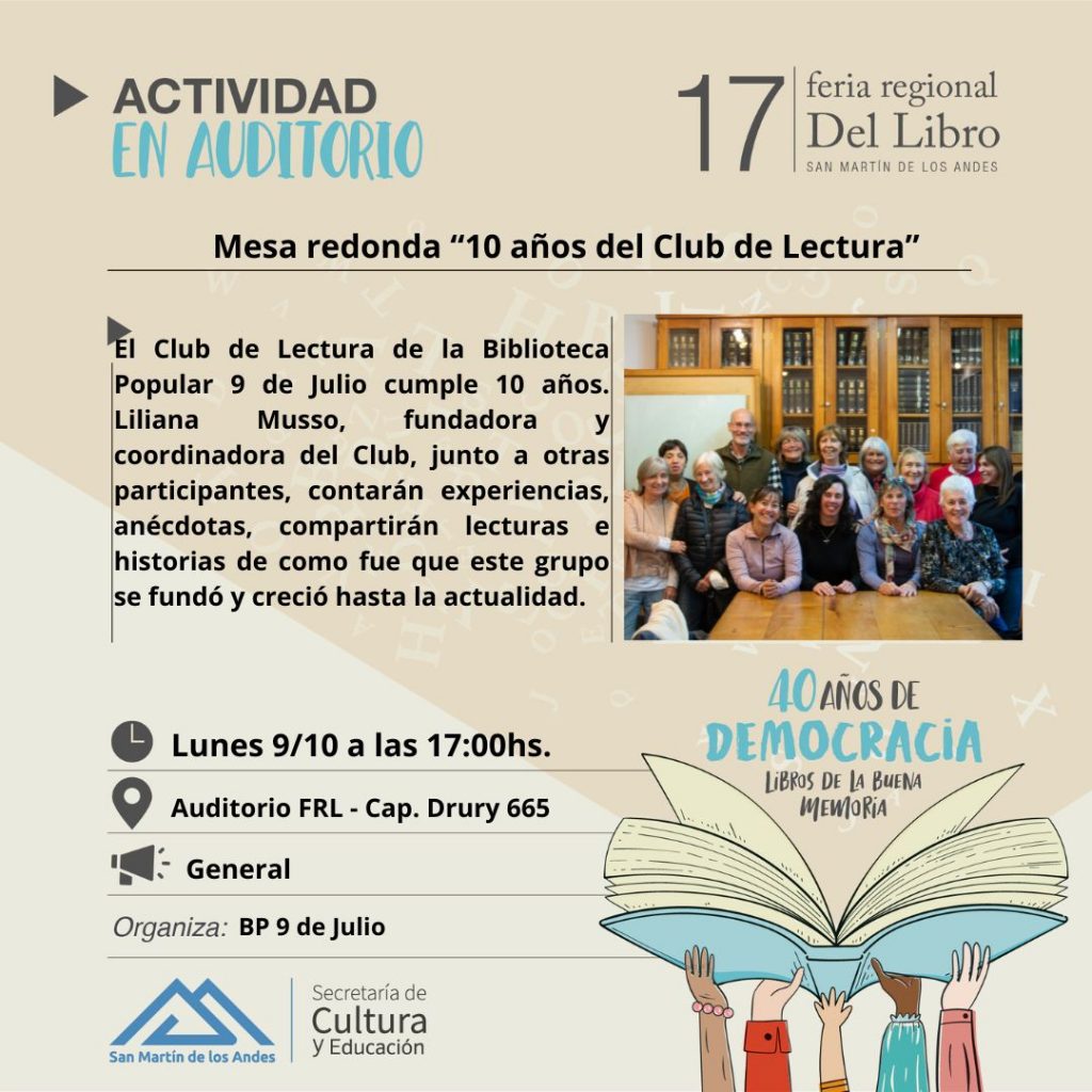 17:00 hs. Club de lectura de la Biblioteca Popular 9 de Julio. Mesa redonda “10 años del Club de Lectura”. Organiza: BP 9 de Julio.