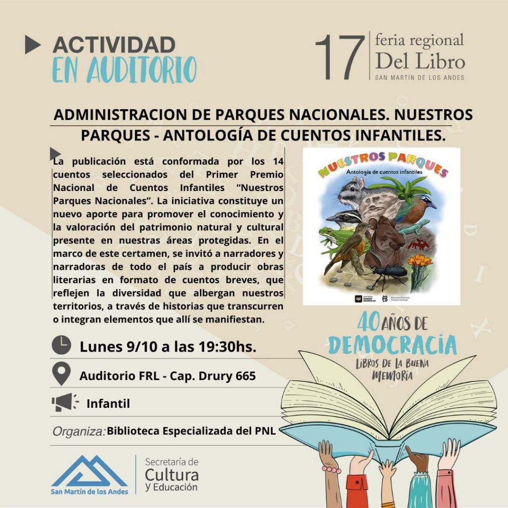 19:30 hs. Administración de Parques Nacionales. Presentación del libro “Nuestros Parques – Antología de Cuentos Infantiles”. Destinada a público infantil. Organiza: Biblioteca Especializada del PNL.