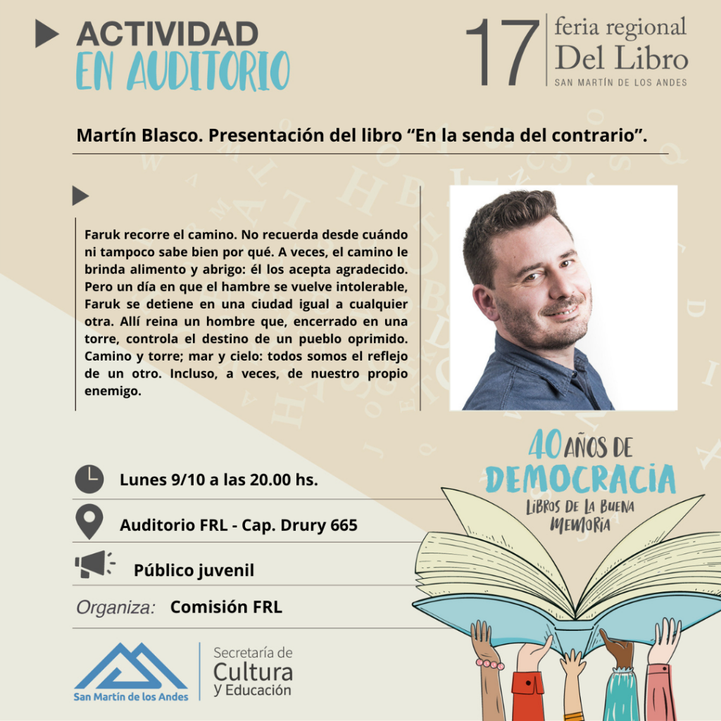 20:00 hs. Martín Blasco. Presentación del libro “En la senda del contrario”. Destinada a público juvenil. Organiza: Comisión FRL FRL y Editorial Norma-Kapelusz.
