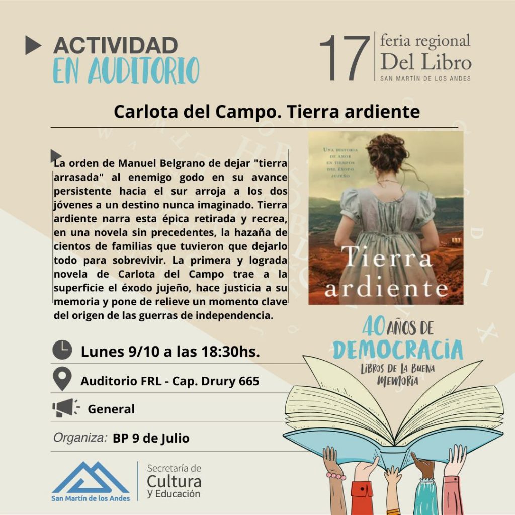 18:30 hs. Carlota del Campo. Presentación del libro “Tierra ardiente”. Organiza: BP 9 de Julio.