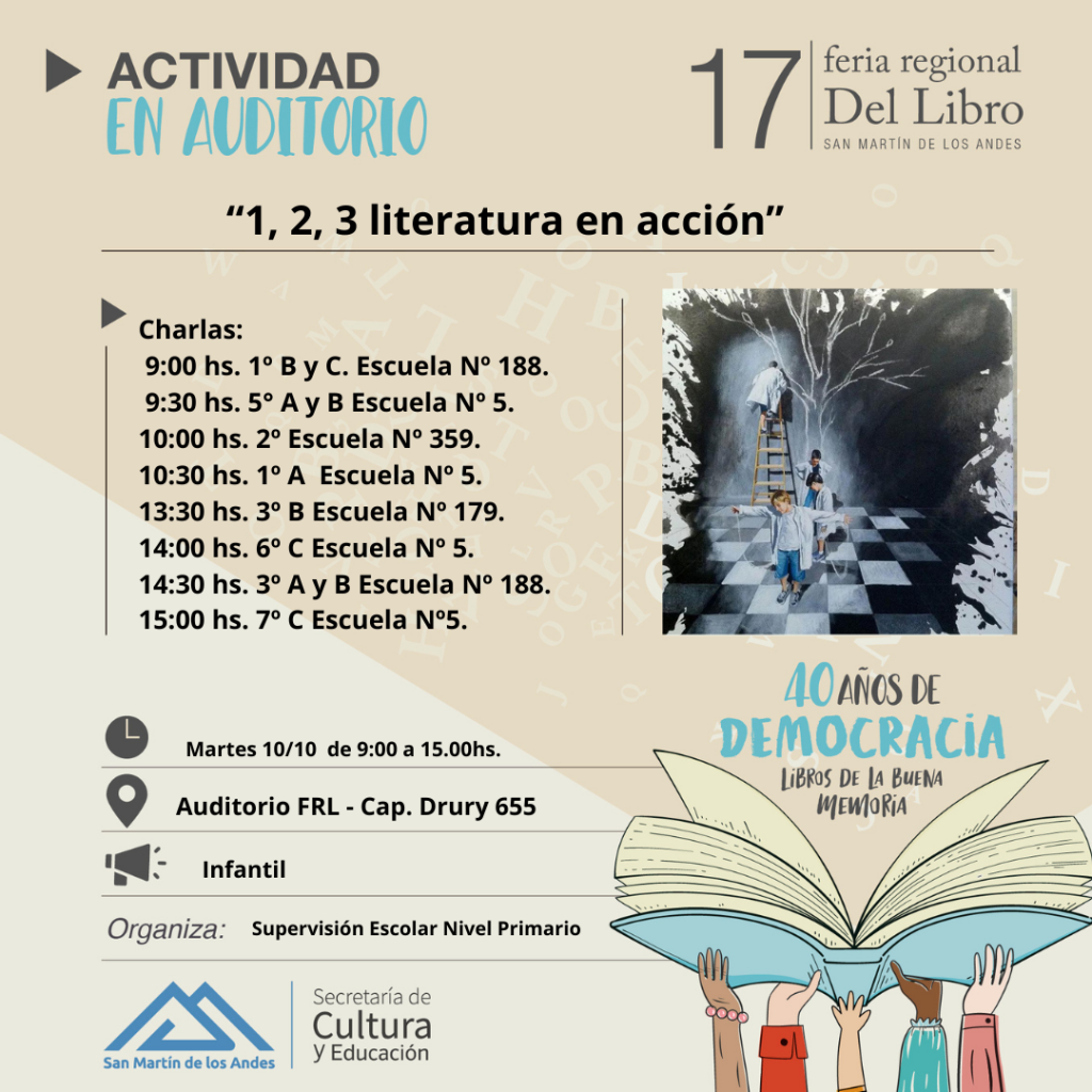 9:00 a 10:30 hs. Actividad de escuelas primarias. Conferencia “1, 2, 3 literatura en acción”. Organiza: Supervisión Escolar Nivel Primario.