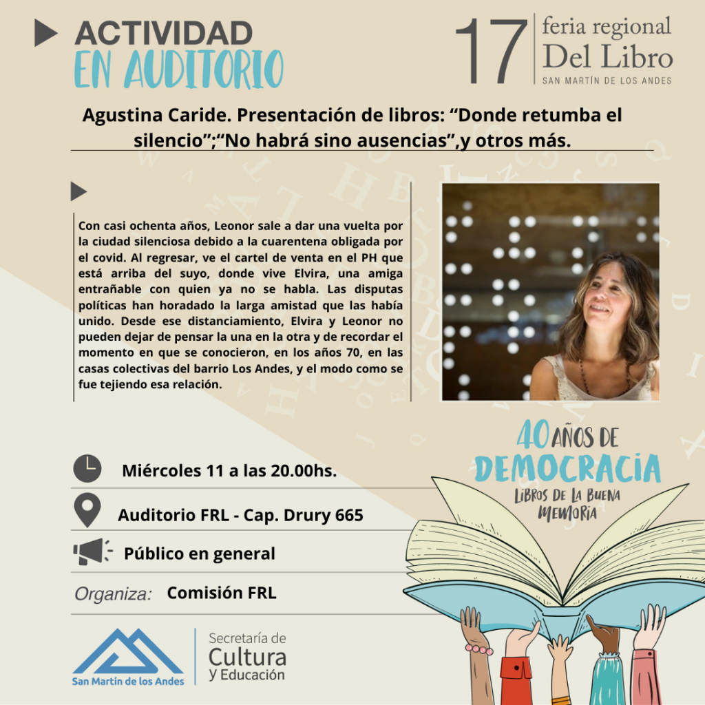 20:00 hs. Agustina Carde. Presentación de los libros “Donde retumba el silencio”, “No habrá sino ausencias” y otros. Organiza: Comisión FRL.