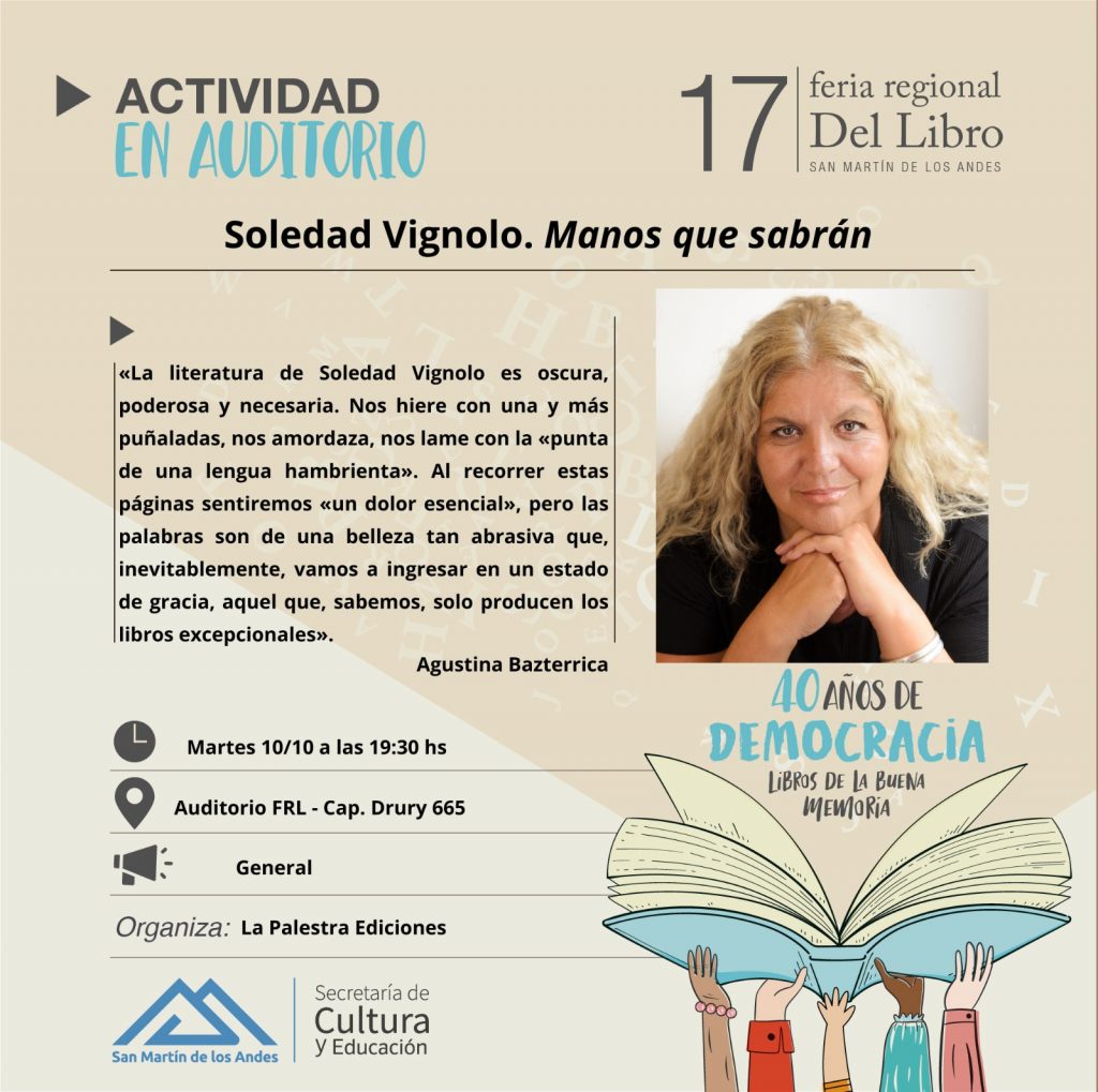 19:30 hs. Soledad Vignolo. Presentación del libro “Manos que sabrán”. Organiza: La Palestra Ediciones.