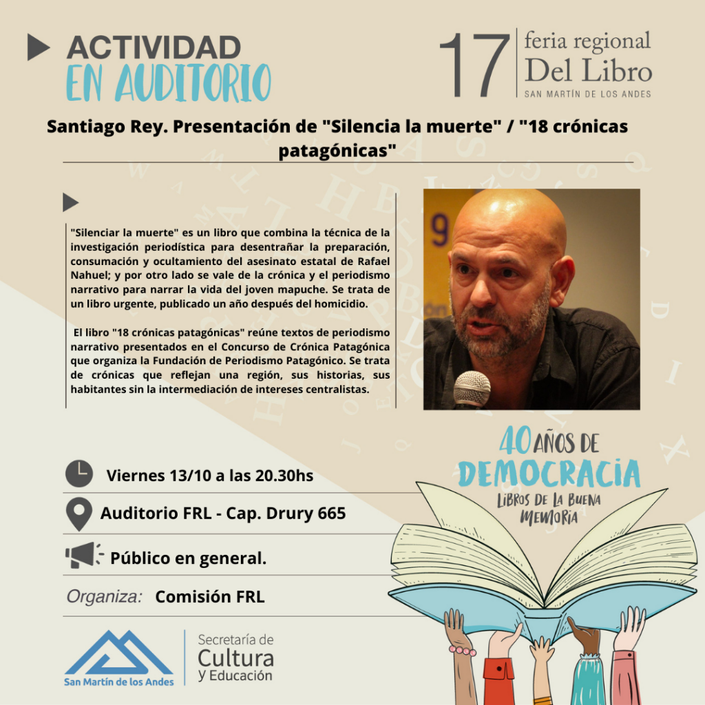 20:30 hs. Santiago Rey / Cronistas de la región patagónica. Presenta-ción de los libros Santiago la muerte” y “18 crónicas patagónicas”. Organiza: Comisión FRL.