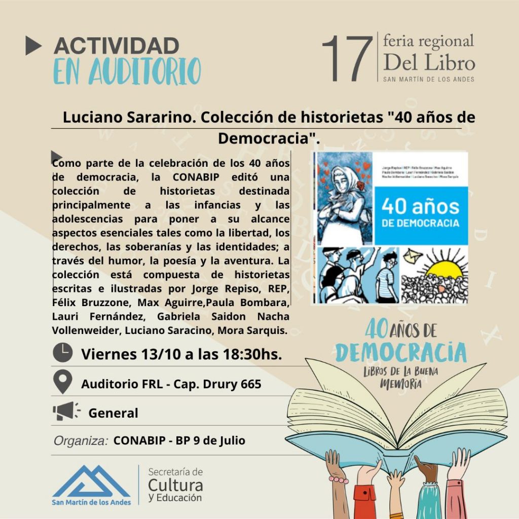 18:30 hs. Luciano Saracino. Presentación de la colección de historietas “40 años de Democracia”. Organiza: CONABIP, BP 9 de Julio.