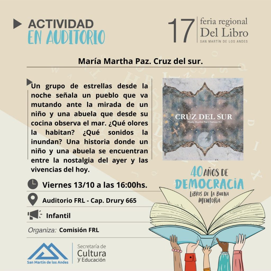 16:00 hs. María Martha Paz. Presentación del libro “Cruz del sur”. Organiza: La Punta del Ovillo Editorial.