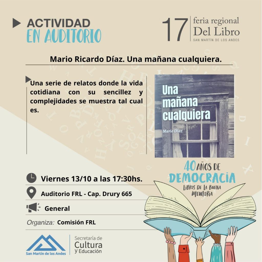 17:00 hs. Eduardo Zinni. Presentación del libro “En la boca del fuego”. 17:30 hs. Mario Ricardo Díaz. Presentación del libro “Una mañana cualquiera”.