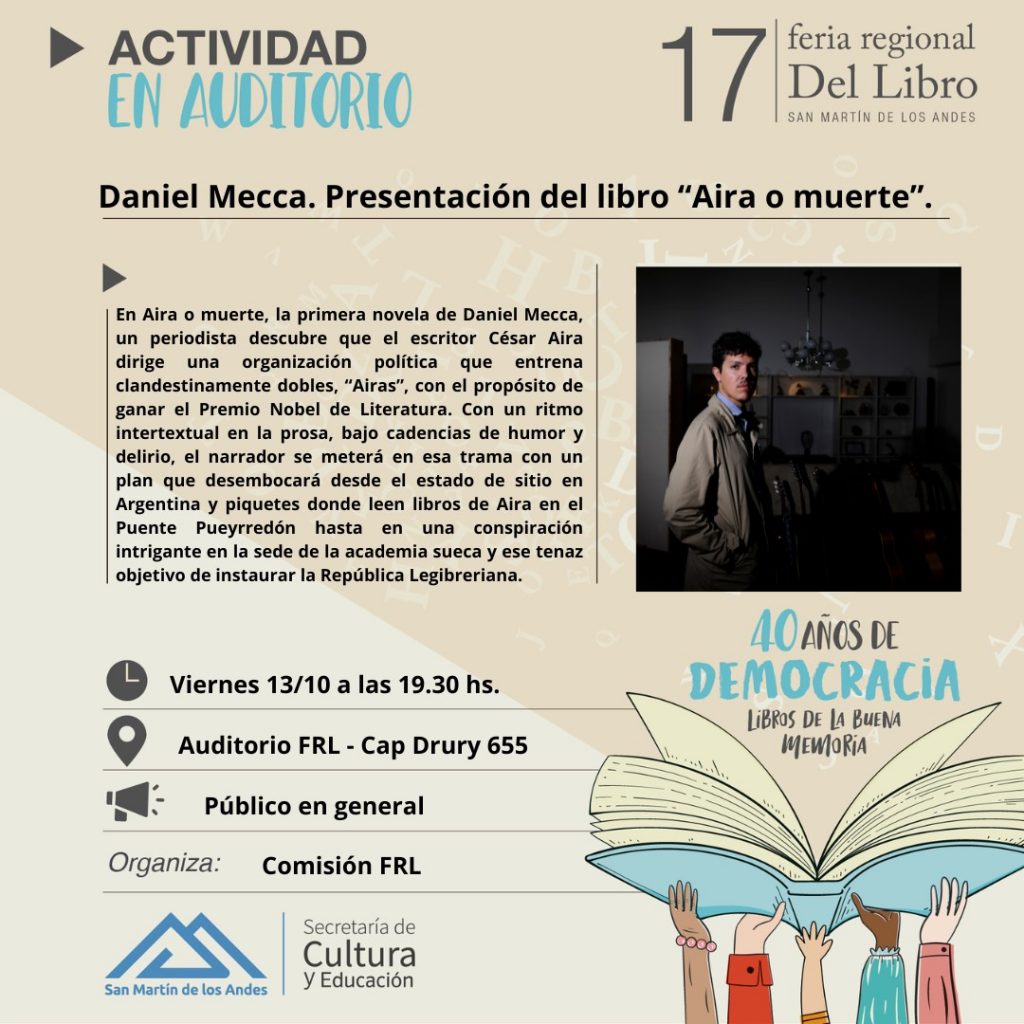 19:30 hs. Daniel Mecca. Presentación del libro “Aira o muerte”. Organiza: Comisión FRL.