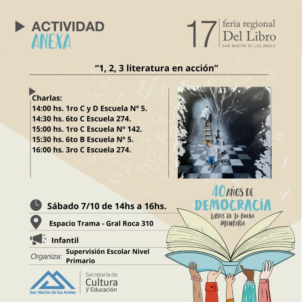 Sábado 7 – 14 a 16 hs. Espacio Trama. Actividad de escuelas primarias. Conferencia “1, 2, 3 literatura en acción”.