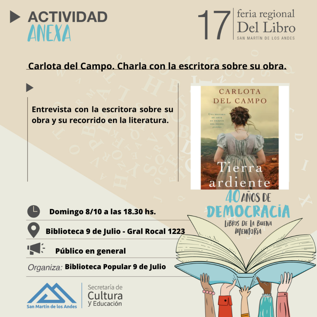 Domingo 8 – 18:30 hs. Biblioteca Popular 9 de Julio. Carlota del Campo. Charla con la escritora sobre su obra.