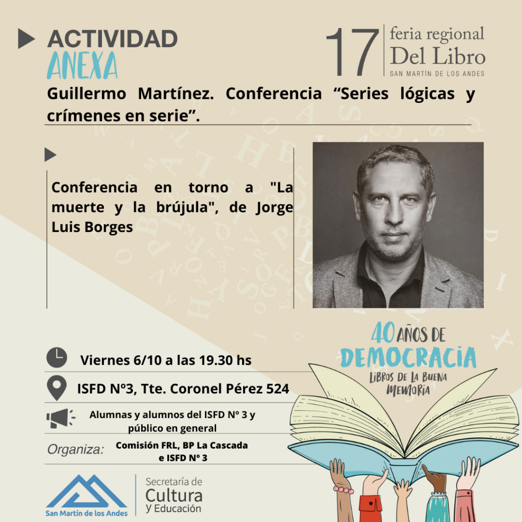 Viernes 6 – 19:30 hs. ISFD N°3. Guillermo Martínez. Conferencia “Series lógicas y crímenes en serie”.