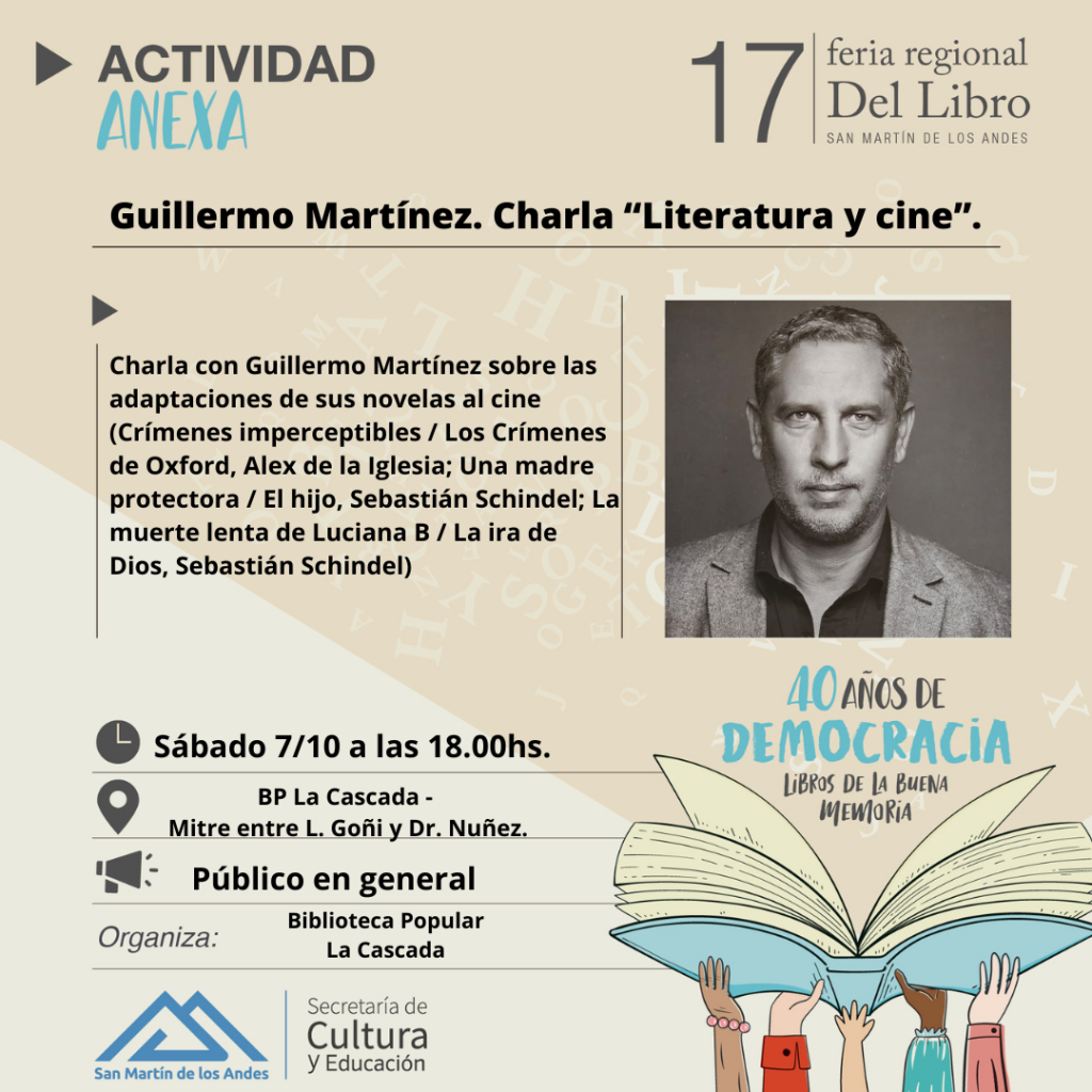Sábado 7 – 18 hs. Biblioteca Popular La Cascada. Guillermo Martínez. Charla “Literatura y cine”.