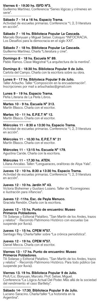 Jueves 12 – 10 hs. 8:30 a 13:30 hs. Espacio Trama. Actividad de escuelas primarias. Conferencia “1, 2, 3 literatura en acción”.