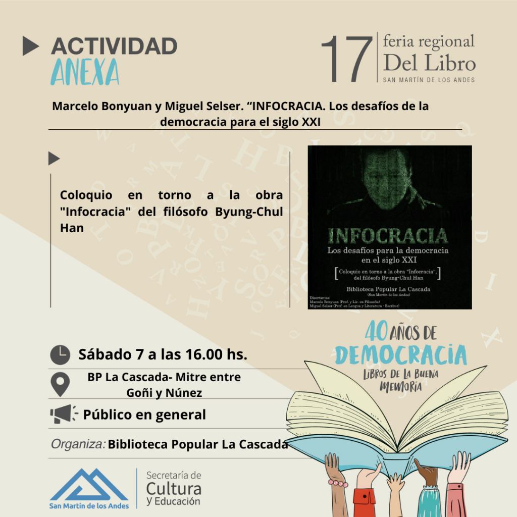Sábado 7 – 16 hs. Biblioteca Popular La Cascada. Marcelo Bonyuan y Miguel Selser. Coloquio “INFOCRACIA. Los Desafíos para la democracia en el siglo XXI”.