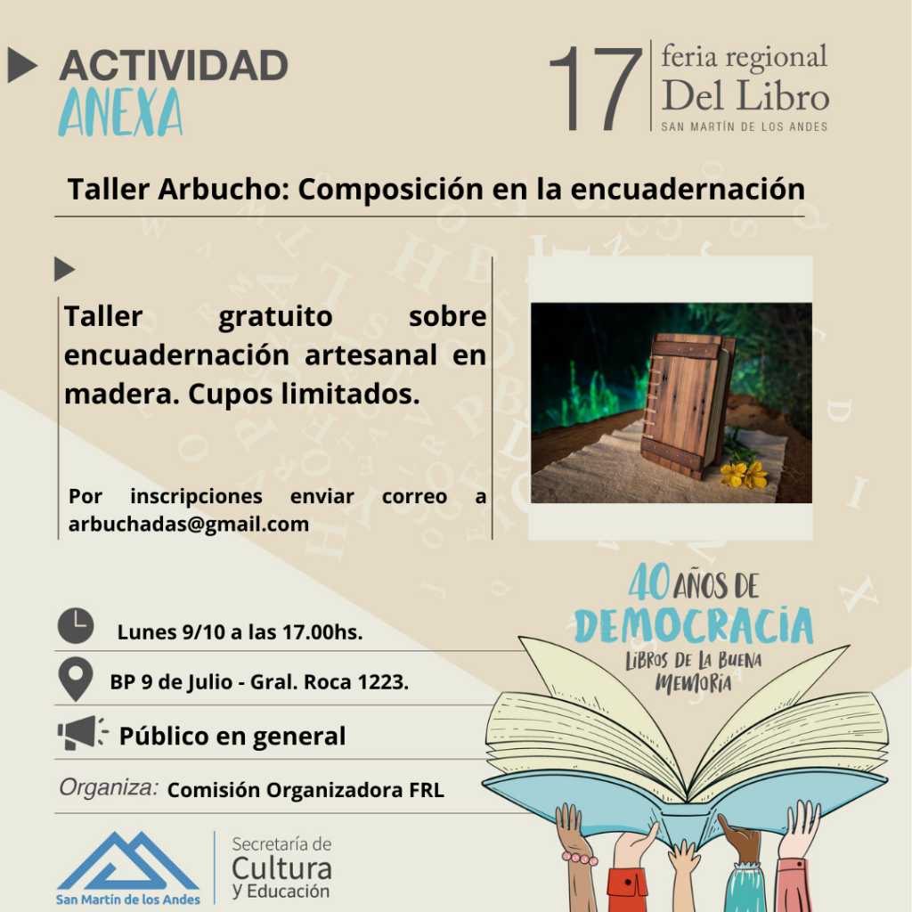 Lunes 9 – 17 hs. Biblioteca Popular 9 de Julio. Taller Arbucho. Taller “Composición en la encuadernación”. Inscripciones por mail a arbuchadas@gmail.com