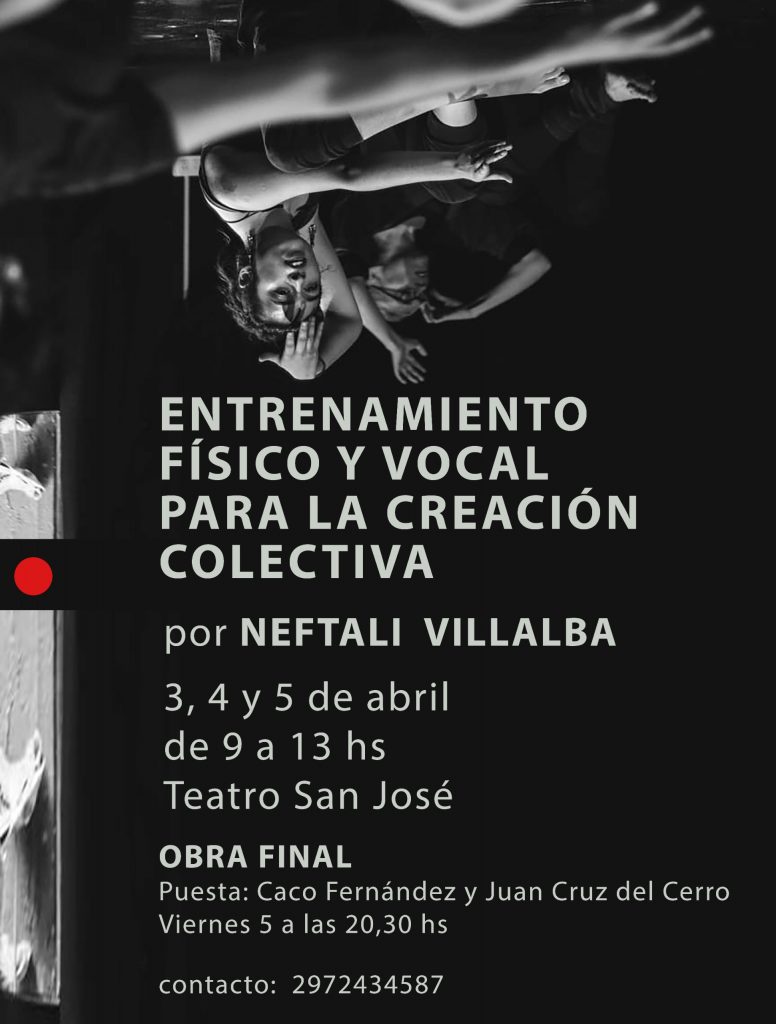 El seminario de ‘ENTRENAMIENTO FÍSICO Y CREATIVO’ lo facilita el artista multidisciplinario, Neftalí Villalba, de la ciudad de San Martín de los Andes, Neuquén, que se dedica a la investigación de la musicalidad en el cuerpo escénico, a nivel coreográfico, musical y teatral, y que se formó en diferentes países como Bolivia, Chile, Italia, Bélgica, Francia y Japón.