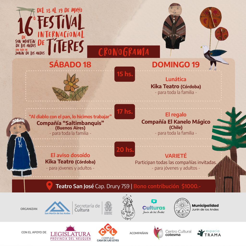 El 16° Festival Internacional de Títeres se realiza con el apoyo y la participación del Complejo Casa de las Leyes, dependiente de la Legislatura de la Provincia del Neuquén. Su organización está a cargo de la Secretaría de Cultura de nuestra ciudad y del grupo La Pelela Títeres. Y este año se suma a la propuesta la Secretaría de las Culturas de Municipio de Junín de los Andes, donde se realizarán 18 funciones.