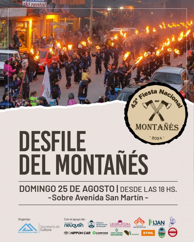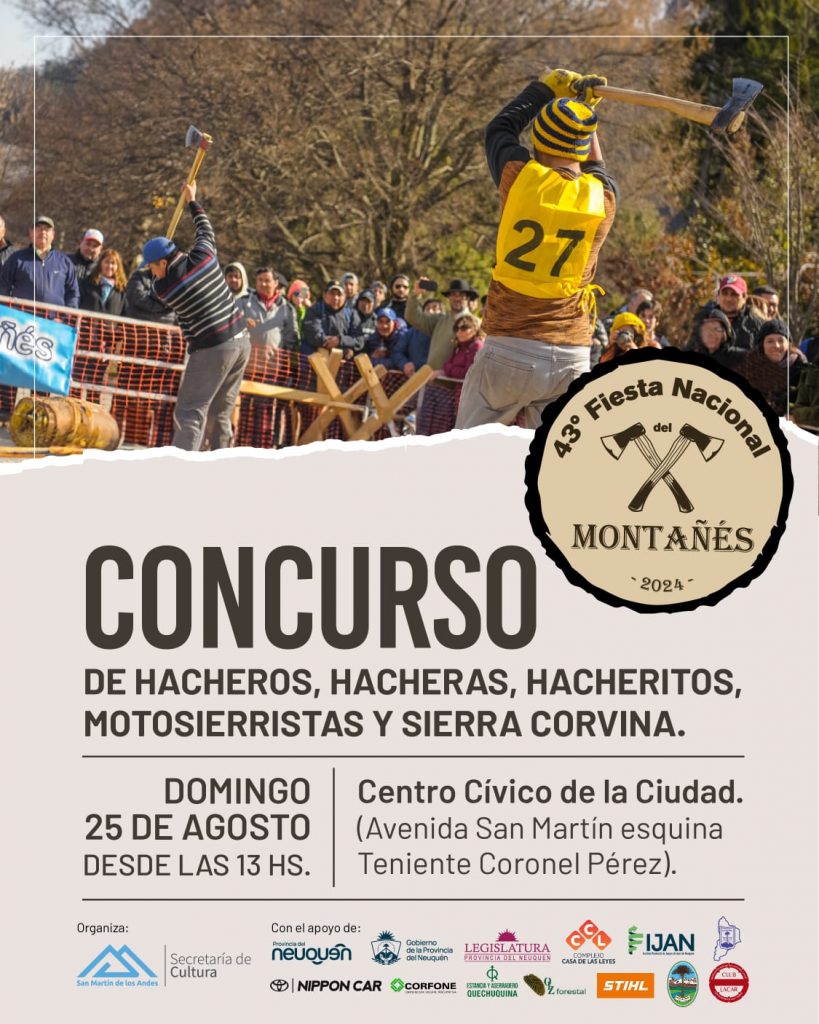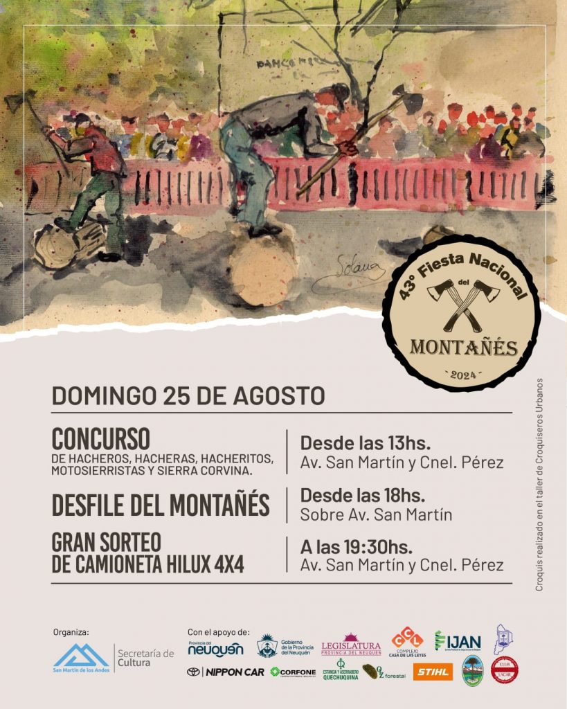 Este domingo 25 de agosto, sobre la Avenida San Martín y en pleno centro cívico de nuestra ciudad, se llevarán a cabo el “Concurso de hacheros, hacheras, hacheritos, motosierristas y sierra corvina”, el “Desfile del Montañés” y el “Gran sorteo de la camioneta Toyota Hilux 4×4”, en lo que será el cierre de la 43ª Fiesta Nacional del Montañés.