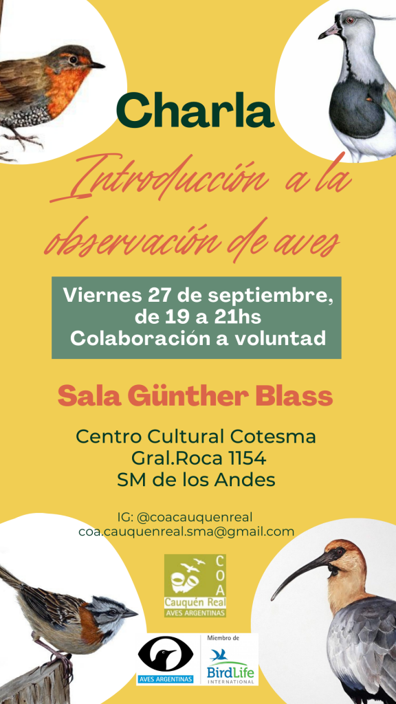 Desde el Club de Observadores de Aves Cauquén Real de San Martin de los Andes, queremos invitarte a la charla “Introducción a la observación de aves”, a realizarse el día viernes 27 de septiembre de 19 a 21 horas, en la Sala Günther Blass del Centro Cultural Cotesma, sito en calle Gral. Roca 1154.