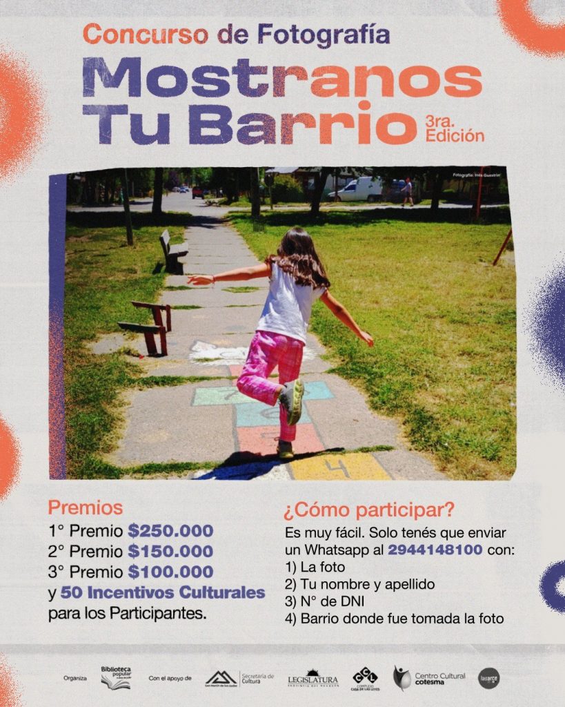 Esta será la última oportunidad para sumarse a las recorridas del concurso “Mostranos tu Barrio”, que entregará un premio de $250.000 pesos a la fotografía ganadora, además de otros premios e incentivos culturales. Las fotos seleccionadas serán parte de una exhibición en la Sala Municipal de Exposiciones Lidaura Chapitel.
