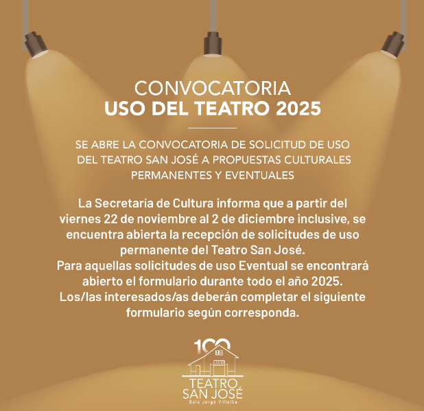 Para presentar propuestas de uso eventual del teatro San José, completar este formulario: https://forms.gle/a3AVh5ZXBwc6kY5h9