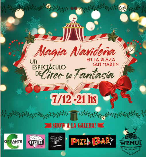 Este Sábado 7 de Diciembre a las 21 hs en la Plaza San Martin invitamos a la comunidad a sentir la magia navideña!! Un super Show Circense y de fantasía con 10 artistas locales en escena, escenografía gigante y maquillaje artístico.