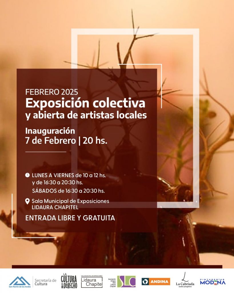 Este viernes 7 de febrero, a las 20hs, en la Sala Lidaura Chapitel, inaugura la Exposición Colectiva y Abierta de artistas de San Martín de los Andes.
