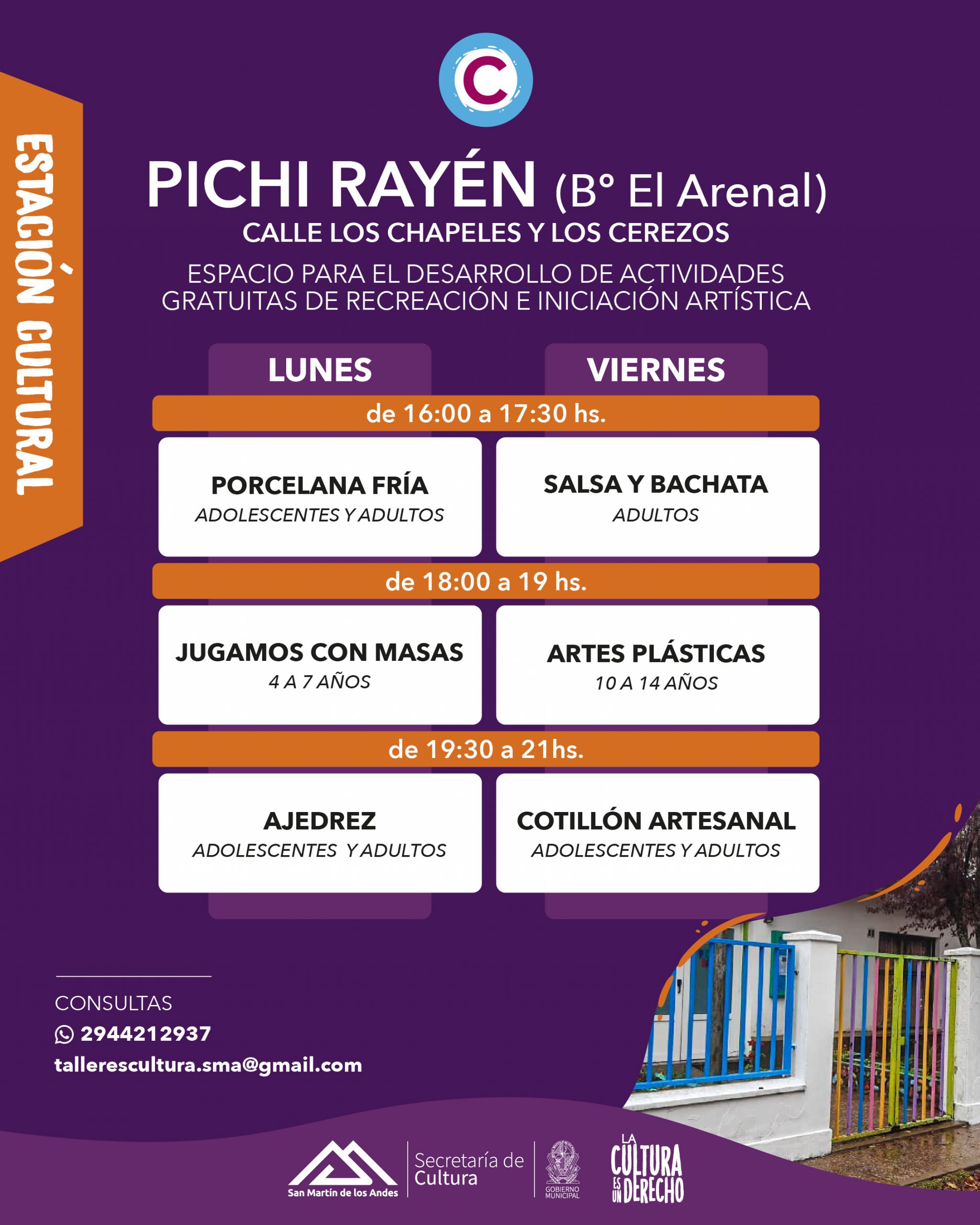 -En la sede del Arenal, Pichi Rayén, el viernes 4/04 a partir de las 16 a 19.30 hs.Los talleres comienzan la segunda semana de abril (7 al 11/04).
