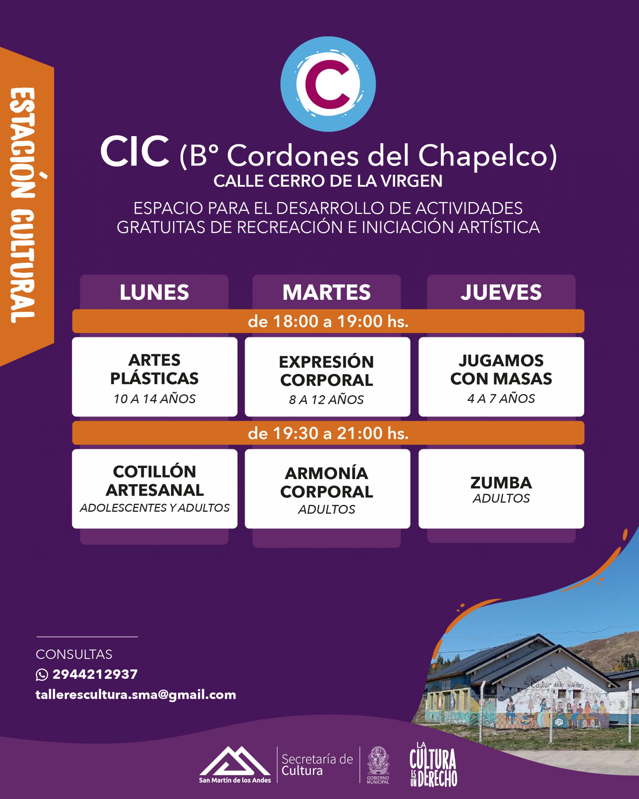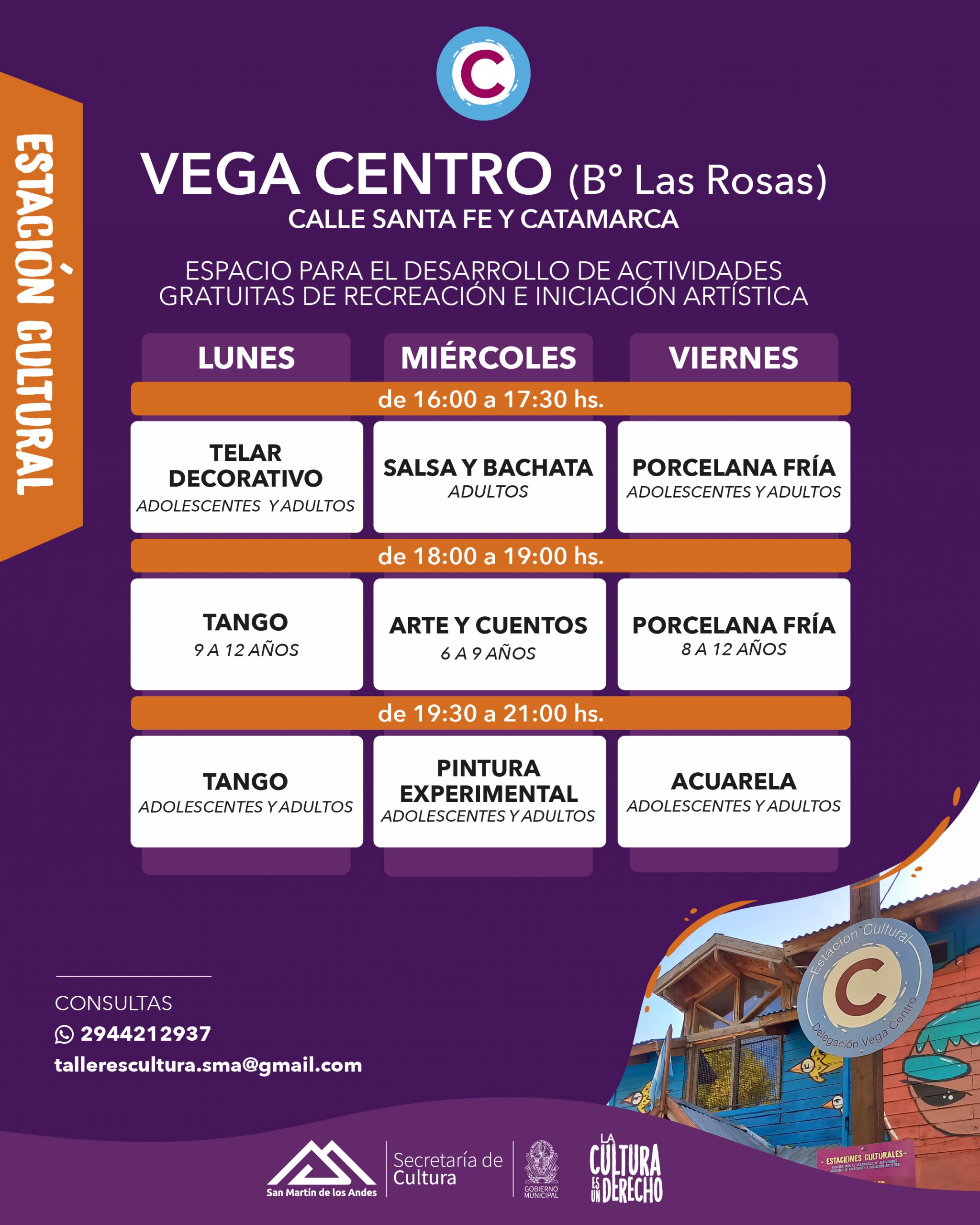 La semana que viene comienzan las inscripciones para los talleres culturales gratuitos que se dictan en 3 sedes: en Cordones del Chapelco (CIC – Cerro de la Virgen 1845), en Vega Centro (Santa fe 447) o en el Arenal (Pichi Rayen Los Chapeles y Los Cerezos). Las clases comienzan la segunda semana de abril (7 al 11/04).