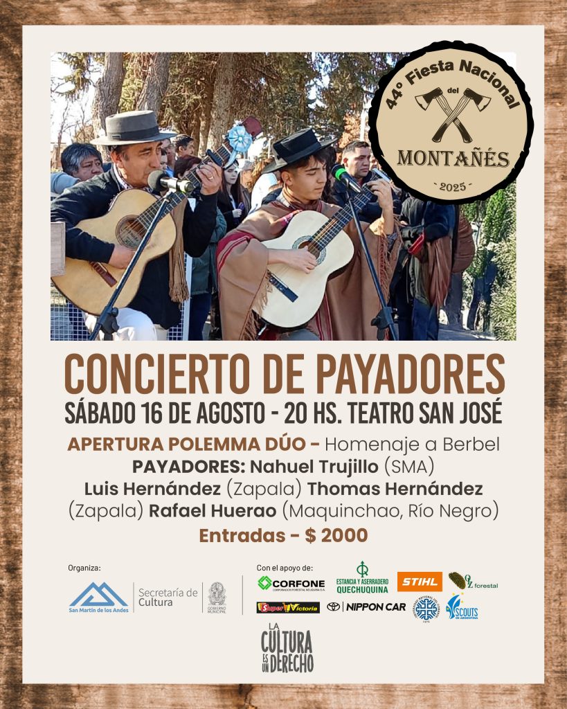 En el concierto se presentarán Luis Hernández y su hijo Thomas, oriundos de Zapala, Rafael Huerao, de la localidad de Maquinchao, Río Negro, y el payador sanmartinense Nahuel Trujillo.