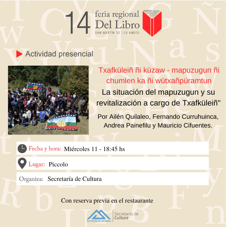 Ailén Quilaleo, Fernando Curruhuinca, Andrea Painefilu y Mauricio Cifuentes hablarán de la situación del mapuzugun y trabajo de revitalización a cargo de jóvenes mapuche que se está realizando. La actividad está coordina por Iris Romero.
