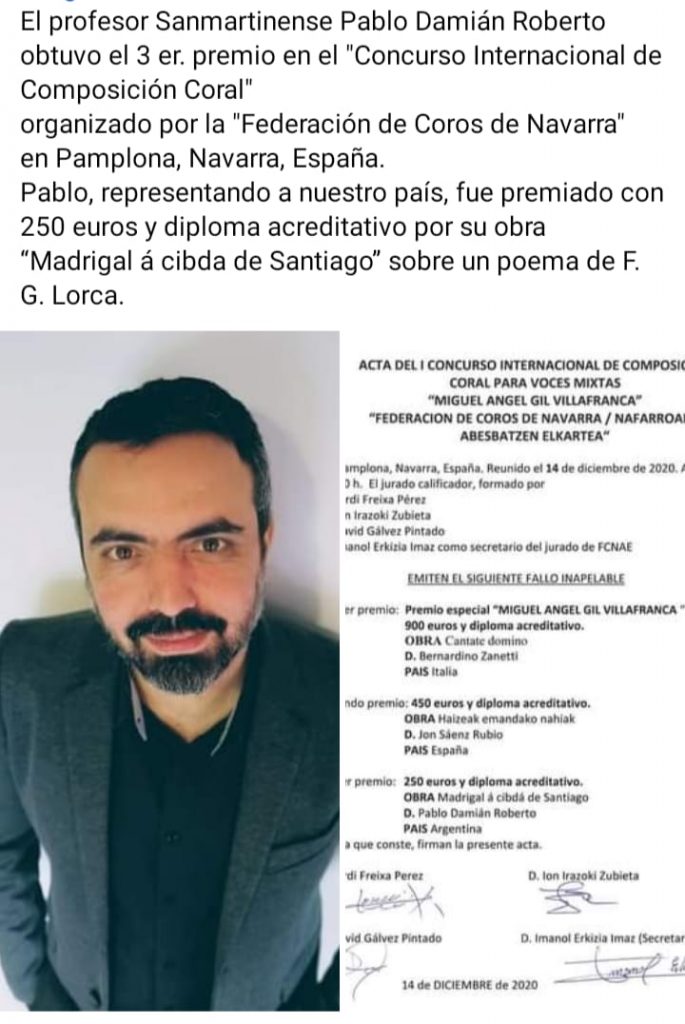 La Secretaría de Cultura de San Martín de los Andes saluda y felicita al profesor de música local Pablo Roberto, tras haber obtenido el 3er premio del Concurso Internacional de Composición Coral, organizado por la Federación de Coros de Navarra, en España.