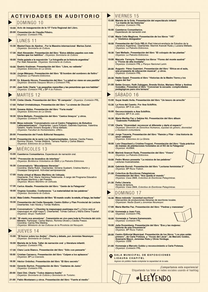 Listado de stands de venta de libros – desde las 14:30hs en la globa frente a la Sala Municipal Lidaura Chapitel.