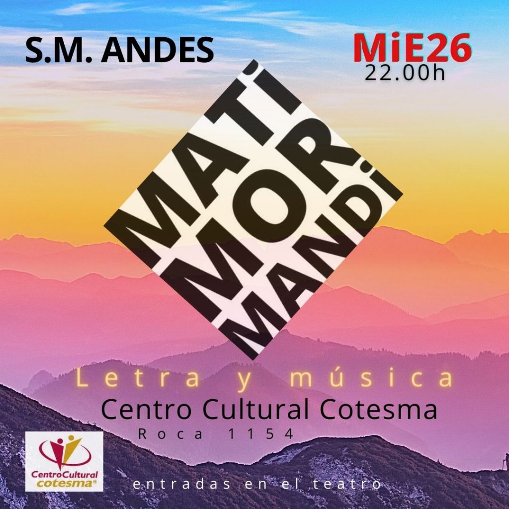 Mati Mormandi, Buenos Aires 1975, compositor, escritor, cantante, pianista, lleva adelante un amplio cancionero poético y filosófico, grabó una veintena de discos, escribió una milena de textos y tocó en incontables escenarios de Argentina y algunos otros países. Su estilo es muy personal, con inevitables raíces en el Tango, la Música Rioplatense, la Canción Clásica y con gran protagonismo de la Palabra y el Momento Presente, en esta ocasión en el Centro Cultural Cotesma presentará los temas nacientes, los textos más frescos y la ya clásica Segunda Tanda, una recorrida por todo el Cancionero a pedido de los presentes.