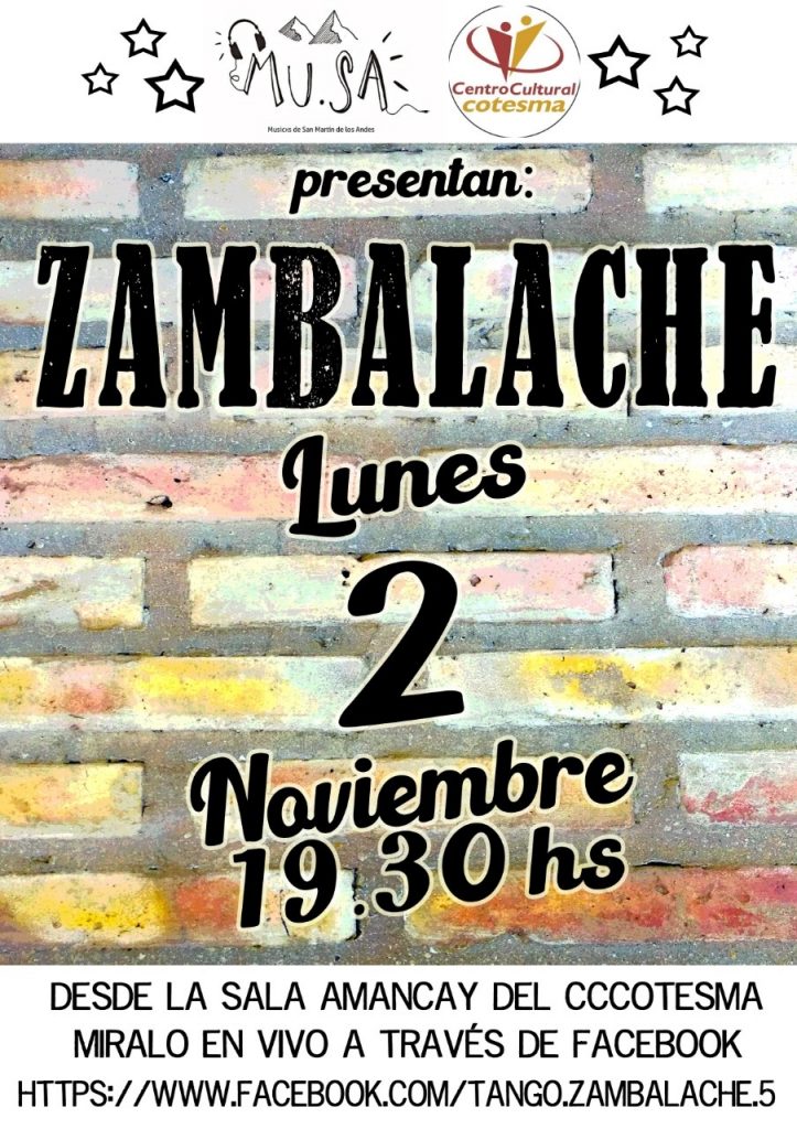 Con el fin de no perder contacto con el buen público tanguero de SMA y del resto del mundo realizarán el próximo lunes 2 de noviembre un vivo por facebook que podrá verse a través de su cuenta Facebook: https://www.facebook.com/tango.zambalache.5