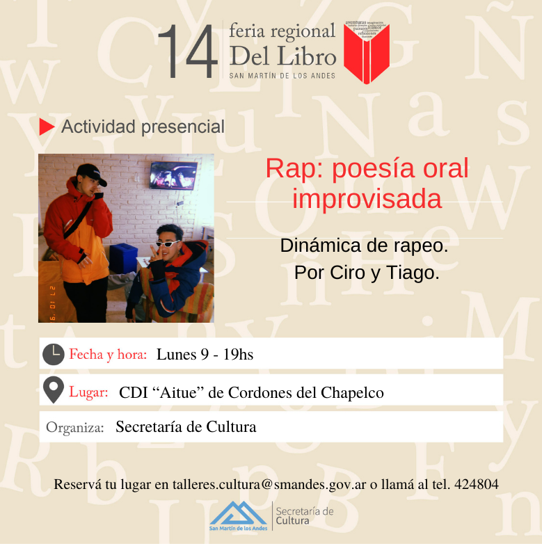 Los raperos y traperos locales Ciro y Thiago realizarán un taller donde explicarán y compartirán distintas técnicas de composición poética como métrica, rima, repetición entre otras, para finalizar escribiéndolas y probándolas. Ambos amigos son jóvenes músicos de nuestra localidad que desde el secundario vienen incursionando en el rap y en el trap, haciendo crecer cada día más sus producciones.