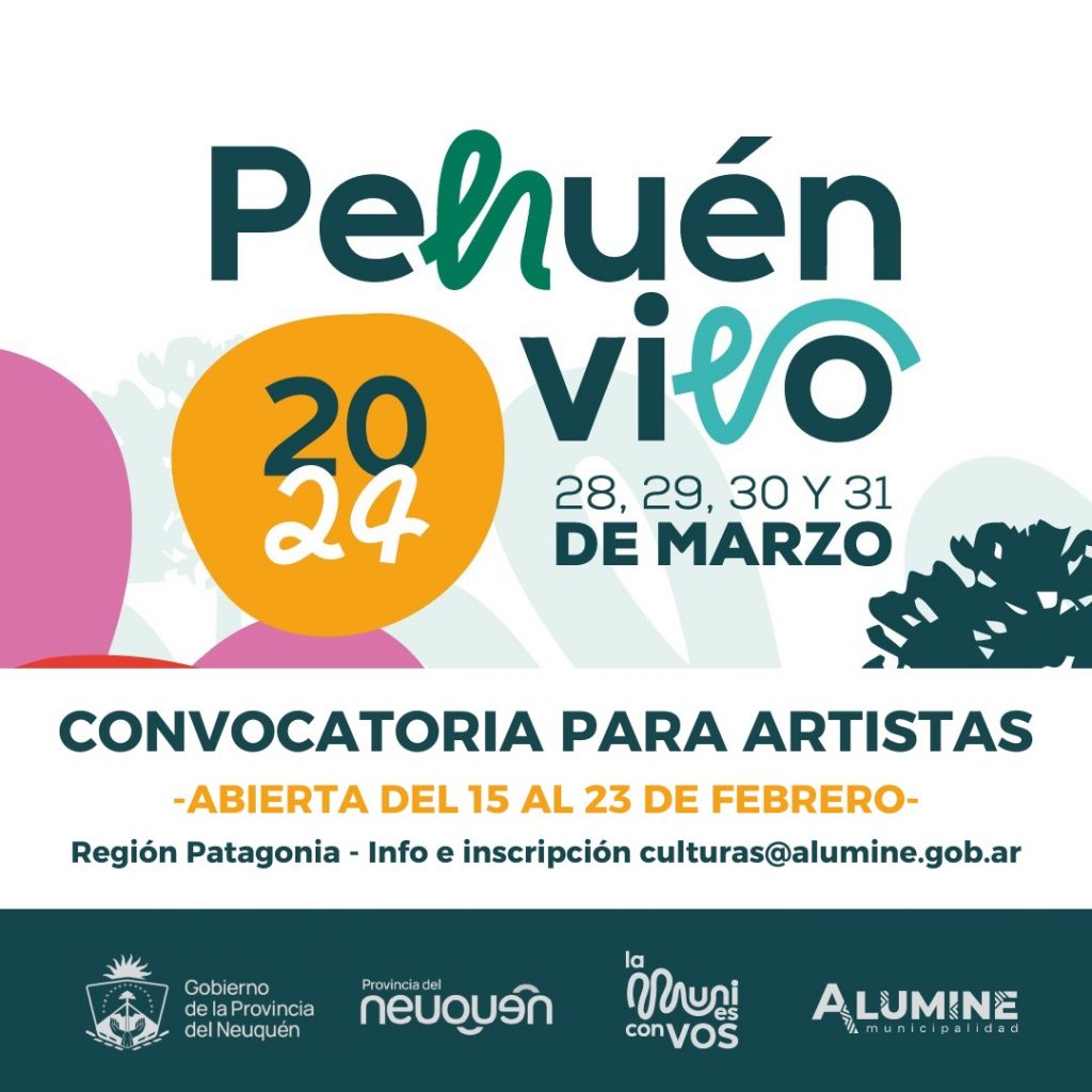 La Municipalidad de Aluminé, a través de la Secretaría de las Culturas invita a proyectos artísticos de Aluminé y de la Región Patagonia a postular para participar de la edición Nº 15 de la Fiesta Nacional del Pehuén, que se realizará los días 28, 29, 30 y 31 de marzo.