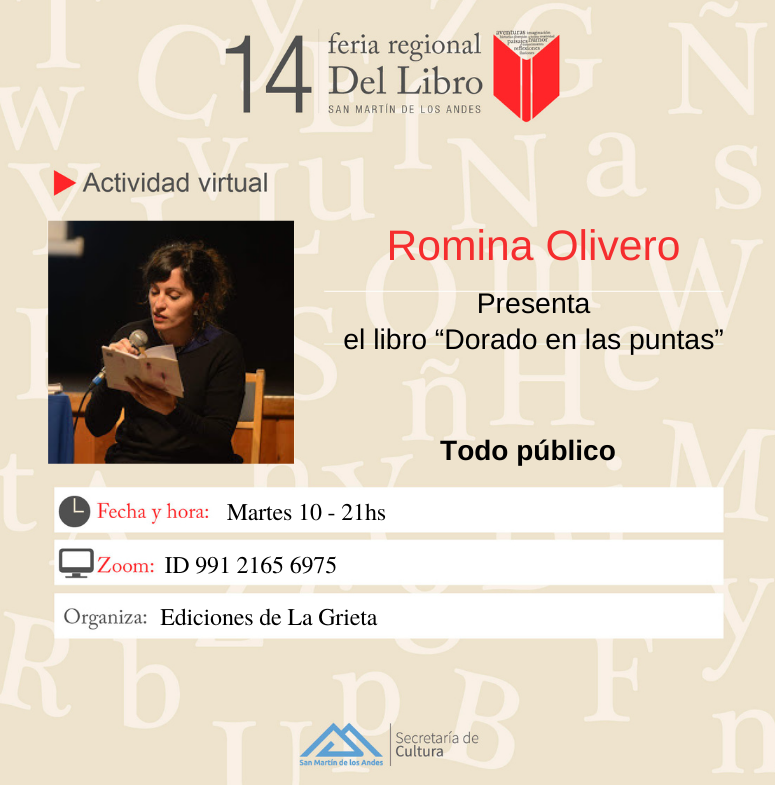 Romina Olivero nació en Bahía Blanca en 1979 y vive desde niña en la ciudad de Neuquén. Es Profesora en Letras por la Universidad Nacional del Comahue. Publicó “Creer o Reventar” (2013, junto a Carina Rita Medina), “Acá es Así” (2016) y “Dorado en las puntas” (2019). Participa de proyectos de poesía grupal y performática.