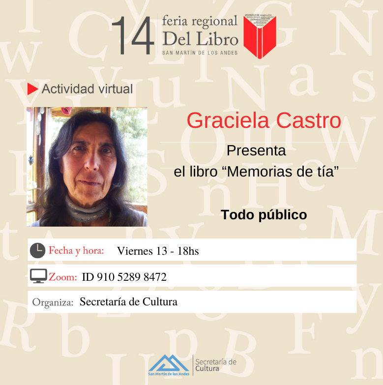 Graciela Castro llegó a Junín de los Andes en 1979 para ejercer la docencia. Desde 1983 reside en San Martín de los Andes, actualmente en el área rural cercana a la ciudad. Se declara escribiente, no escritora, expresándose a través de poemas, textos narrativos y apuntes personales. “El libro de Graciela” (Editorial Plus Ultra, 1985), de su autoría, reúne cuentos y poemas de literatura infantil.