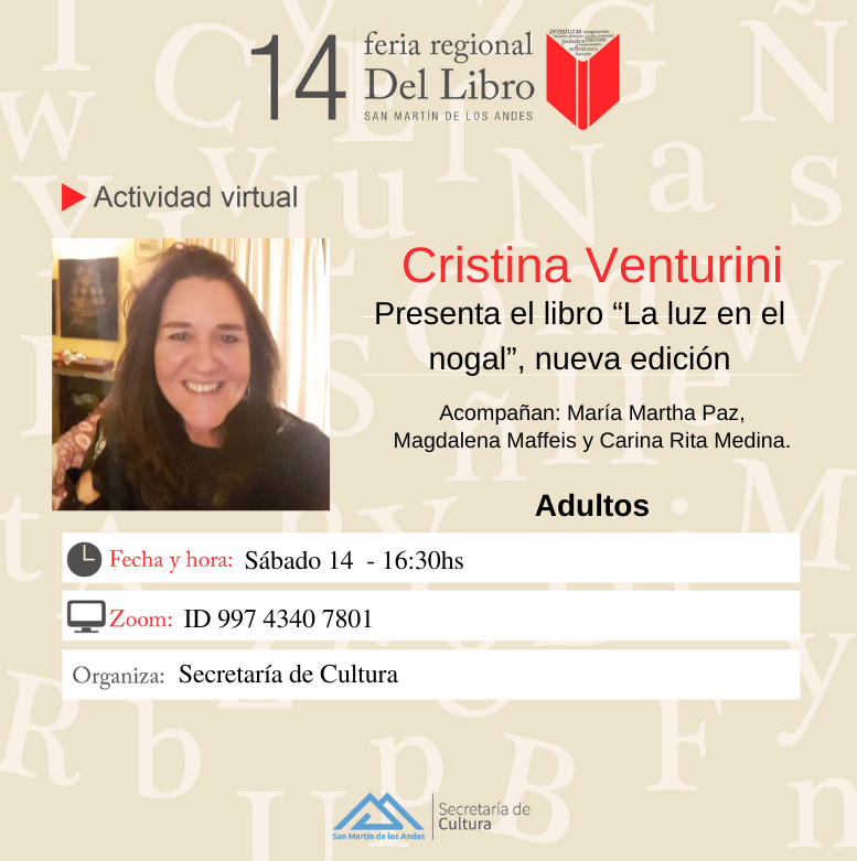 Cristina Venturini fue una de las dos escritoras homenajeadas por la 13ª Feria Regional del Libro de San Martín de los Andes. Nacida en la Provincia de Entre Ríos, reside en San Martín de los Andes desde 1997. Publicó “La voz del viento” (1991), “Trinos elementales” (1995), “Poemas consubstanciales” (2007), junto con Lionel Rivas Fabbri), “La luz en el nogal” (2010), “Jaguar de abril” (2013), “Orcalumis” (2015) y, recientemente, “Zapallo…” y “El perfume de las cosas”.