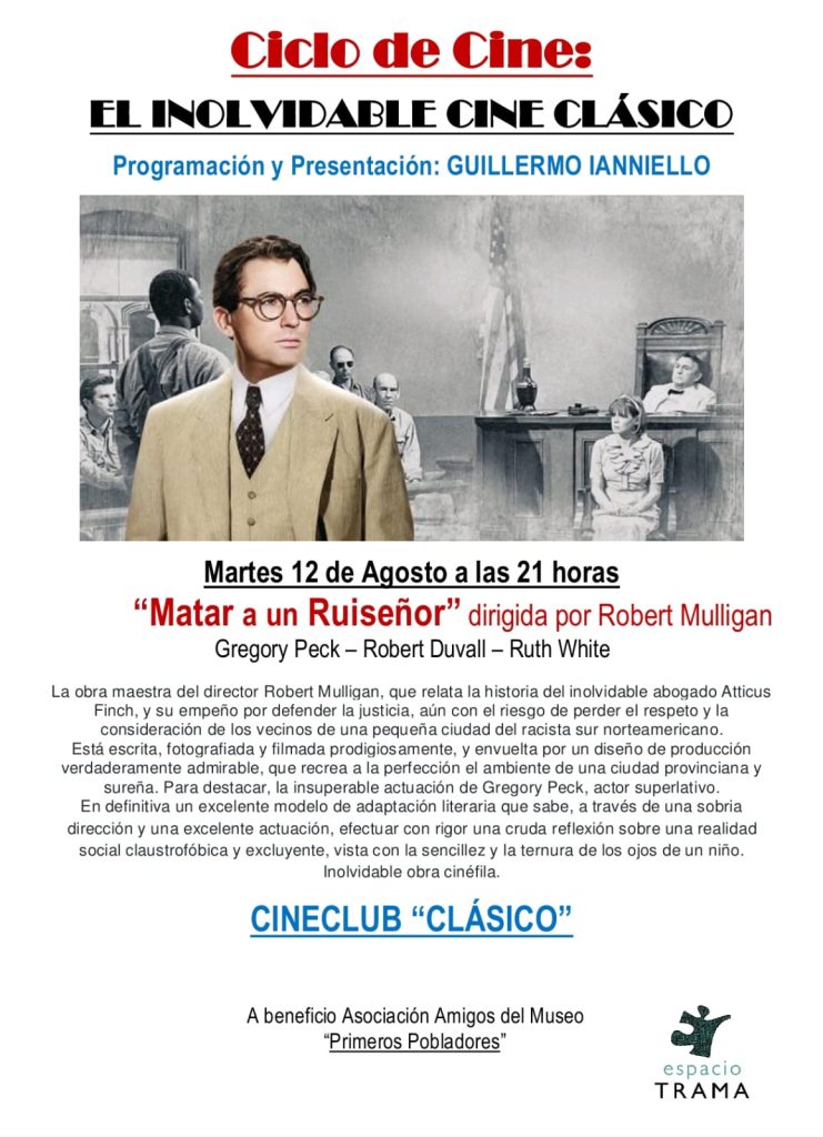 Presentado y organizado por Guillermo Ianniello, este martes 12 de agosto, a las 21hs, continúa el nuevo Ciclo de Cine Clásico en Espacio Trama, en esta oportunidad, con la proyección de “Matar a un Ruiseñor”. El Cineclub clásico se repetirá cada martes con nuevas propuestas cinematográficas y con el valor de las entradas se colabora con la Asociación Amigos del Museo Primeros Pobladores.