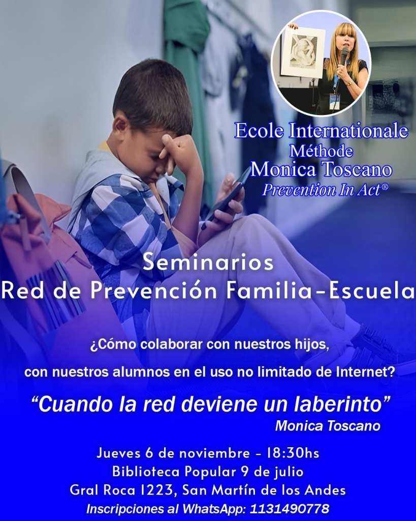 Nuestro próximo encuentro será el jueves 6 de noviembre a las 18:30 hs en la Biblioteca Popular de San Martín de los Andes. Tenemos el honor de contar con la presencia de la Lic. Monica Toscano, creadora del Método Monica Toscano Prevention in Act®️ SEMINARIOS DE LA RED DE PREVENCIÓN FAMILIA-ESCUELA. Módulo IV : “Cuando la red deviene un laberinto”