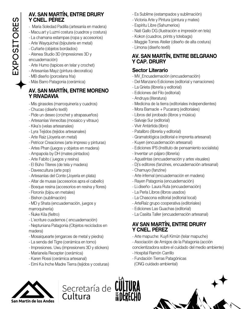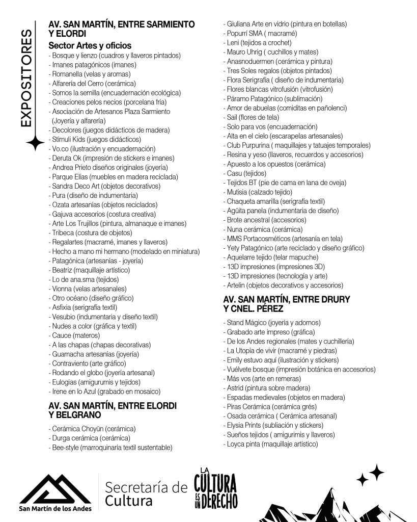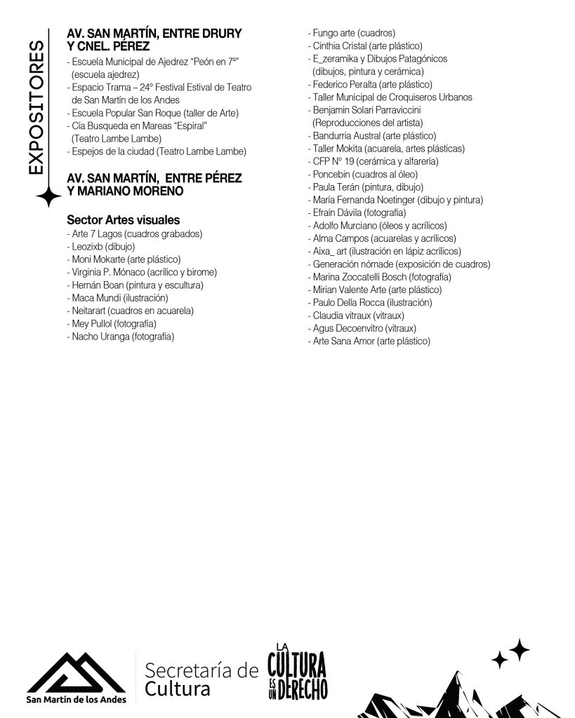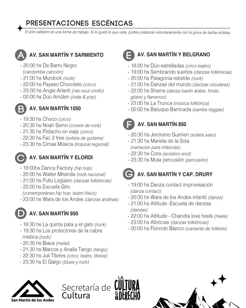 A partir de las 8 de la mañana del domingo 18 de enero, el personal municipal comenzará con los cortes de calles y preparativos para que la Avenida San Martín se llene de magia y arte desde las 18.00 de ese mismo día. Se solicita la colaboración de los vecinos para poder liberar y despejar de autos la Avenida desde la calle Sarmiento hasta Rivadavia evitando en lo posible el estacionamiento de vehículos a fin de facilitar la demarcación de espacios de expositores y artistas escénicos. Por otro lado, durante el desarrollo del evento pedimos que NO ESTACIONEN en las bocacalles señaladas con vallas dado que funcionan como salida de emergencia», explicaron desde la Secretaría de Cultura.